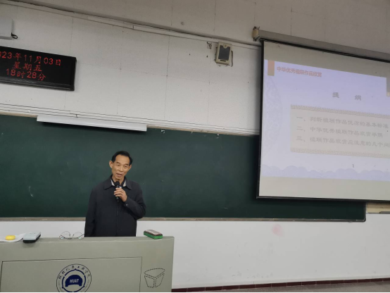 (文/图 安军)11月3日晚上,原市教育局副局长、十堰广播电视大学(教育学院)党委书记,现任十堰市楹联学会会长王学范教授应邀为pg游戏师生做了一场题为《中华优秀楹联作品欣赏》的讲座。