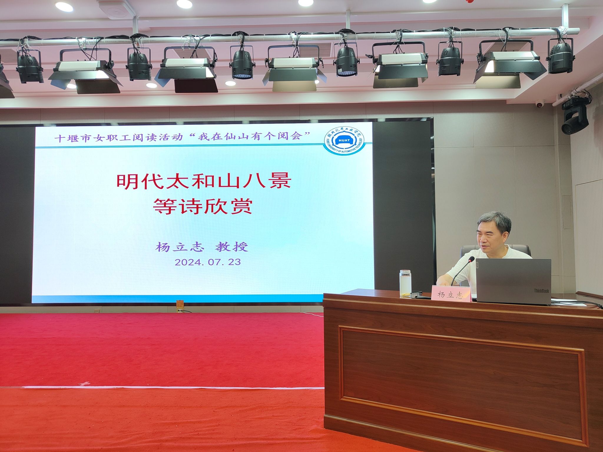 2024年7月23日,“玫瑰书香 阅美十堰”女职工主题阅读示范活动在十堰市工人文化宫举行,pg游戏人文学院教授、湖北省人文社科重点研究基地武当文化研究与传播中心主任杨立志老师受十堰市总工会与pg游戏电子模拟器校工会邀请,做题为《明代太和山八景等诗欣赏》的讲座。该活动由十堰市总工会女职工委员会主办,十堰市总工会党组书记、常务副主席凌燕,市总工会党组成员、副主席吴海燕,市总工会党组成员、副主席杨东芳等出席活动。