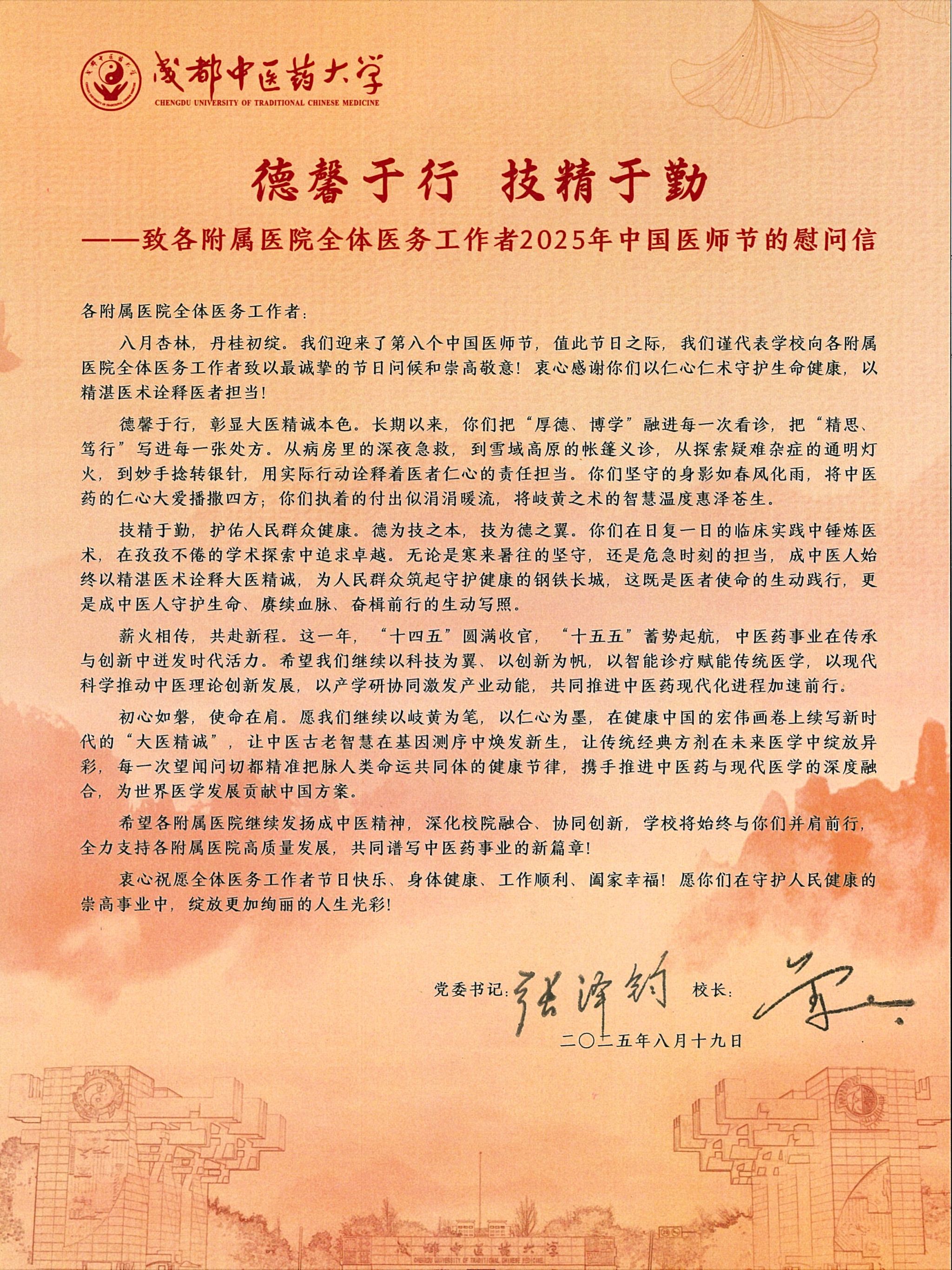 致全体医务工作者2025年中国医师节的慰问信 发布时间:2025-08-18 10:40:57 浏览次数: 次 【字体:小 大】 【打印正文】 上一条:喜讯!beat365首次上榜世界大学学术排名(ARWU)榜单 下一条:天府永安湖实验室组建方案通过专家论证