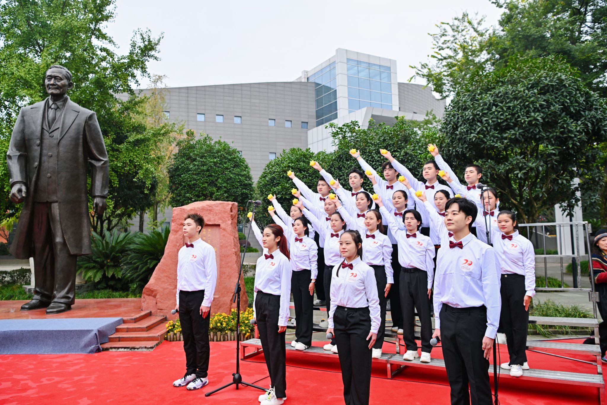 20世纪30年代,李斯炽先生以远见卓识拓荒中医教育,在“废止中医”的逆流中筑起四川中医药薪火相传的阶梯。观礼嘉宾驻步李斯炽先生雕像前广场,敬仰李斯炽先生如松风骨、若海襟怀、仁爱之志。到会嘉宾依次向李斯炽先生雕像敬献鲜花。