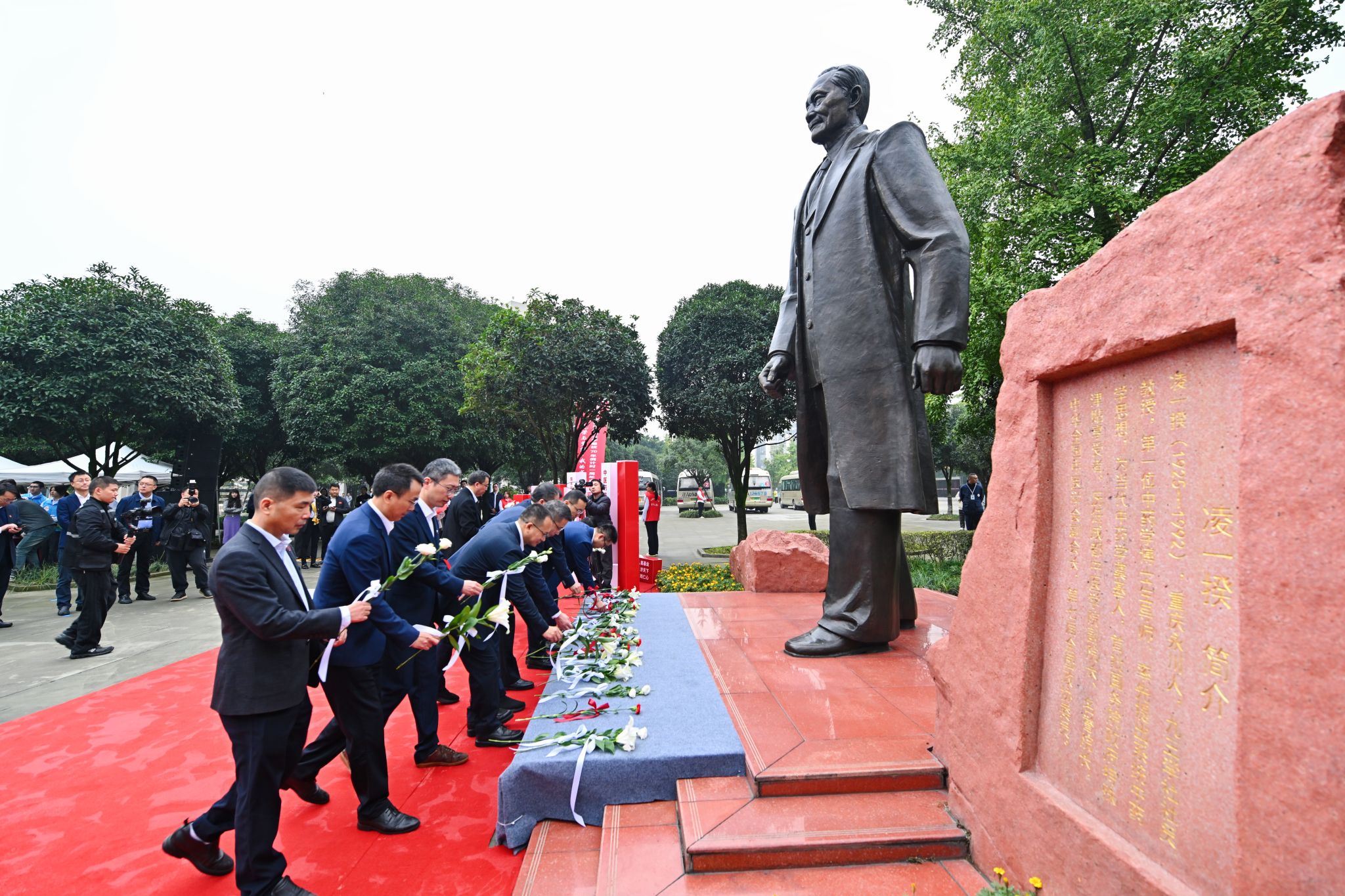 凌一揆先生毕生致力于中药教育与科研事业,是学校中药学科开创者,更是我国现代中药学奠基人。观礼嘉宾停足凌一揆先生雕像前广场,缅怀先生筚路蓝缕之功,致敬先生立教兴药之德。凌一揆家属及观礼嘉宾依次为雕像敬献花束。