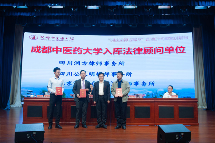 刘毅向四川润方律师事务所、四川公生明律师事务所、北京炜衡(成都)律师事务所3家单位颁发学校入库法律顾问单位聘书,向杨支才等9名专家颁发法律顾问团成员聘书。