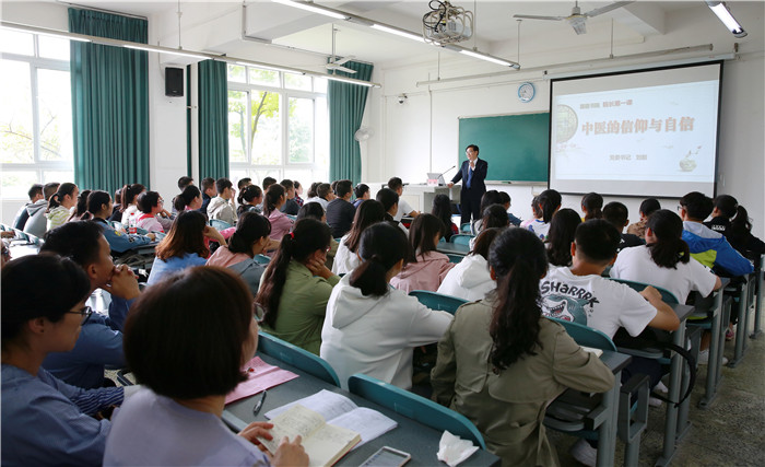 开学典礼结束后,刘毅为首届新生讲授开学第一课,引导学生坚定中医自信,坚守中医信仰。