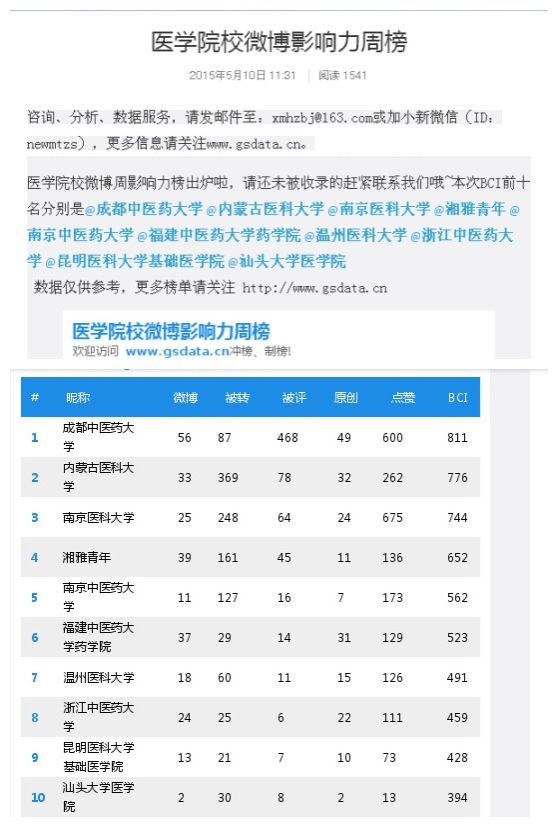 学校官方微博在医学院校微博影响力周榜中排名第一 发布时间:2015-05-12 11:10:00 浏览次数: 次 【字体:小 大】 【打印正文】 上一条:学校官方微博在医学院校微博影响力周榜中排名第一 下一条:第三附属医院参加成都百万职工技能大赛喜获佳绩