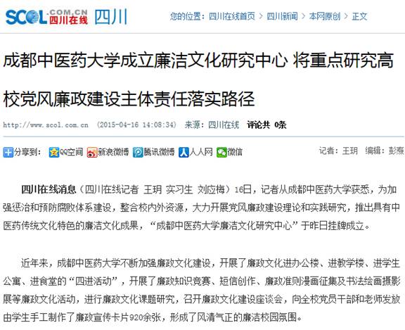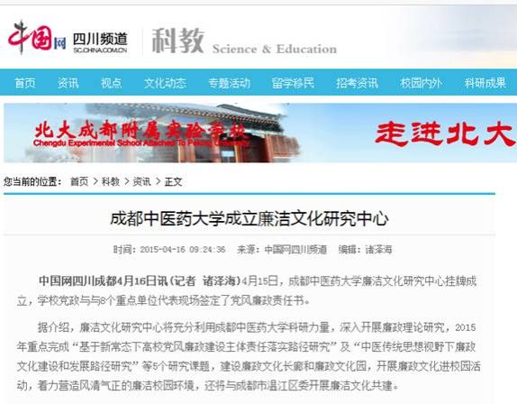 四川在线消息(四川在线记者 王玥 实习生 刘应梅)16日,记者从beat365平台唯一官网获悉,为加强惩治和预防腐败体系建设,整合校内外资源,大力开展党风廉政建设理论和实践研究,推出具有中医药传统文化特色的廉洁文化成果,“beat365平台唯一官网廉洁文化研究中心”于昨日挂牌成立。