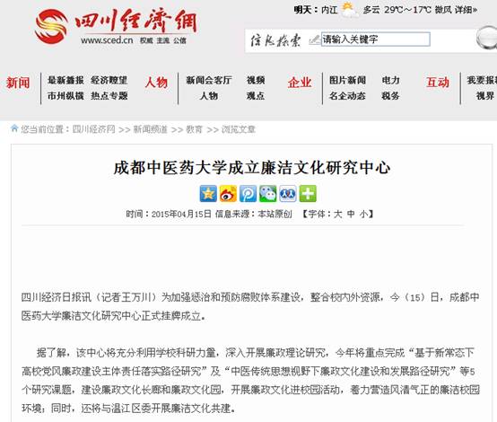 据了解,该中心将充分利用学校科研力量,深入开展廉政理论研究,2015年重点完成“基于新常态下高校党风廉政建设主体责任落实路径研究”及“中医传统思想视野下廉政文化建设和发展路径研究”等5个研究课题,建设廉政文化长廊和廉政文化园,开展廉政文化进校园活动,着力营造风清气正的廉洁校园环境,同时,还将与温江区委开展廉洁文化共建。