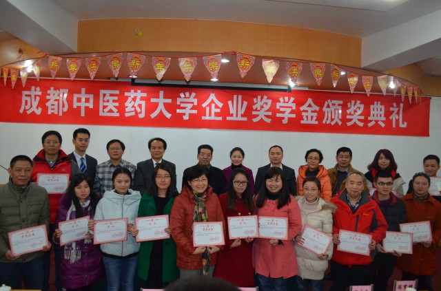1月12日,学校举行2014年度研究生企业奖学金颁奖典礼,学校党委书记马跃荣、副校长彭成、四川好医生药业集团有限公司董事长耿福能、成都华神集团股份有限公司董事长周蕴瑾、北京固生堂中医养生健康科技股份有限公司董事长代表李锐出席典礼,研究生院负责人及企业冠名奖学金获奖导师、学生参加典礼。