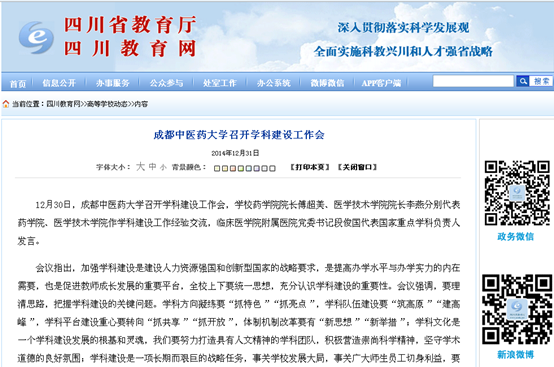 资料显示,十一五以来,beat365平台唯一官网坚持以国家重点学科建设为核心、省级重点学科建设为抓手,进一步突出学科特色,凝练学科方向,打造创新团队,构筑创新平台,提升整体水平,学科建设工作取得长足进展。目前学校拥有国家级一级重点学科一个,国家级二级重点学科三个;国家中医药管理局重点学科二十三个,四川省一级重点学科三个,四川省二级学科十八个,四川省重点学科建设项目三个,四川省医学重点学科四个,成都市医学重点学科两个,校级重点和特色学科十二个。