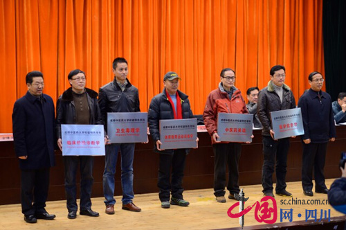 党委副书记、副校长沈涛宣读了学校关于公布《临床检验诊断学》《卫生毒理学》《体育教育运动训练学》《中医药英语》《医学信息学》等5个2014年新增校级特色学科名单的决定,马跃荣、梁繁荣为新增校级特色学科授牌。