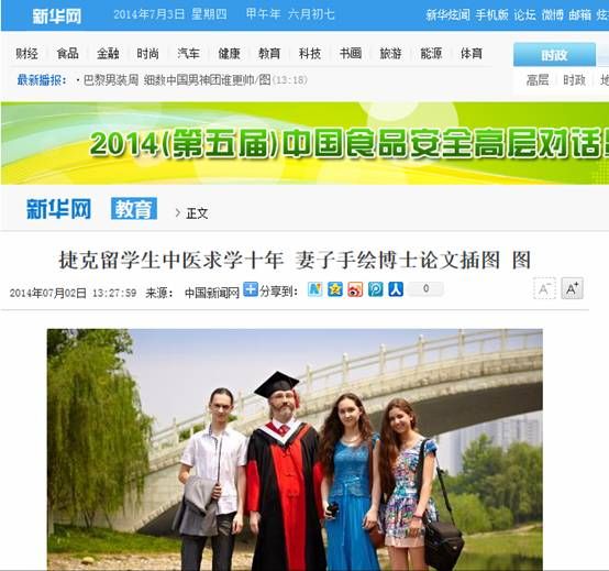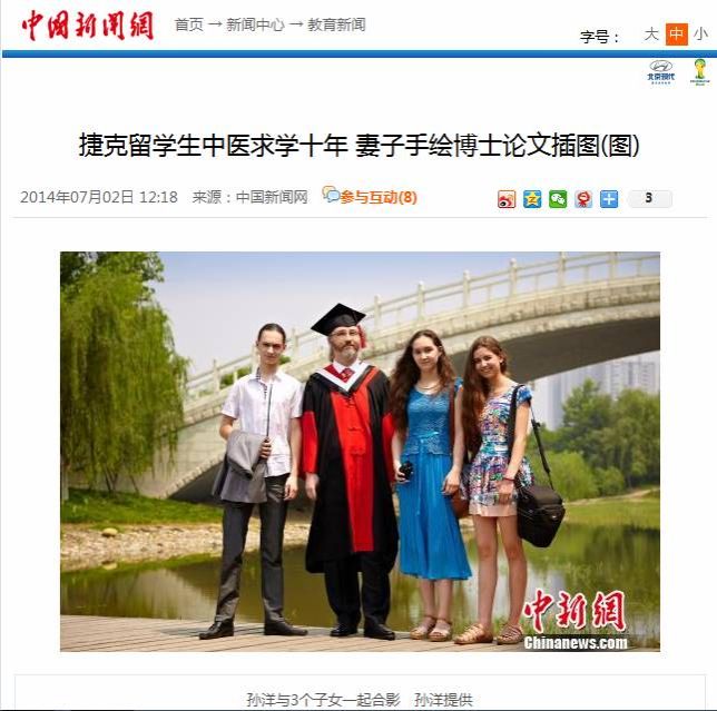 7月2日,中国新闻网报道了beat3652014届博士毕业生、捷克留学生孙洋不远千里举家来到中国求学,攻读针灸学博士的经历,孙洋导师、校长梁繁荣教授同时接受采访。新华网、人民网、凤凰报网等近百家网络媒体转载,其他转载近70次。以下是详细内容: