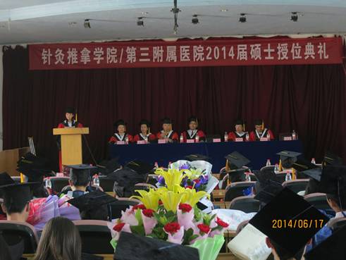 6月17日,针灸推拿学院/第三附属医院在十二桥校区举行2014届硕士研究生毕业典礼暨授位仪式。校党委副书记、副校长沈涛,副校长、学院分学位委员会主席余曙光,学院分学位委员会全体成员出席典礼,学院院长李瑛教授主持大会,学院全体硕士研究生导师、137名2014届硕士毕业生和亲友代表参加典礼,典礼在庄严的《国歌》声中拉开序幕。