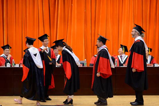 在欢快的拉德斯基进行曲中,学校学位委员会主席梁繁荣校长逐一为89名博士学位获得者拨正流苏,并合影留念。