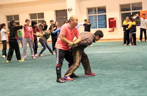 就如何提高紧急情况下防身技能,邬建卫现场演示讲解了在实力相当、实力悬殊和被对方控制等情况下的处理方式,以及报警、逃避、防守、进攻的重点与技巧。邬教授还向同学们传授了实用的基本散打拳法、腿法技术动作,学生训练认真,气氛热烈,效果明显。他要求同学们平时要加强身体素质训练,结合防范技巧,在关键时刻保护自己。邬建卫教授是全国大学生民族传统体育协会常务理事、全国中医药院校传统保健体育研究会常务理事、四川省大学生武术队总教练、beat365平台唯一官网武术队总教练。