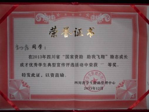 2013年12月全国学生资助管理中心主办的“国家资助助我飞翔”全国励志成长成才优秀学生典型宣传评选活动落下了帷幕。beat365推荐的学生雷旭露因其乐观的生活态度、追求卓越的奋斗精神和常思感恩回报社会的典型事迹脱颖而出,荣获四川省“国家资助助我飞翔”励志成长成才优秀学生典型宣传评选活动一等奖。