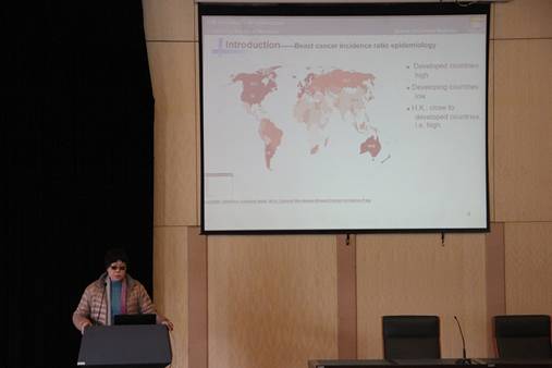 陈建萍博士长期从事肿瘤的临床及实验研究。本次报告她从乳腺癌的临床治疗入手,主要介绍了乳腺癌靶向治疗新分子靶标LDH-A的发现,中药鸡血藤中活性成分的提取及其治疗乳腺癌的效果等研究工作,为中药新药的研究提供一种新方法,使参加报告的师生深受启发。