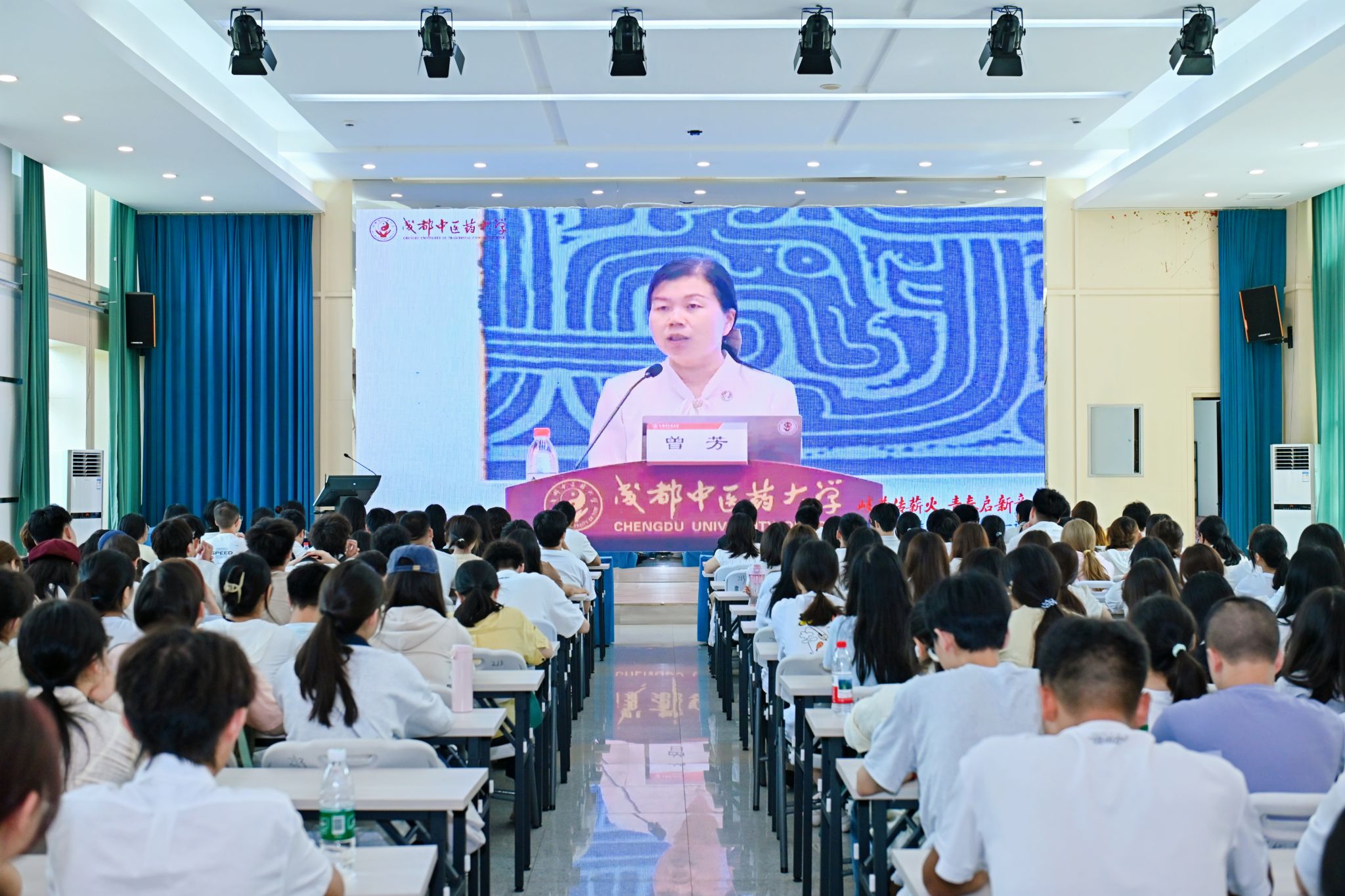 “‘汲润经典’读好源泉之书,‘恪守仁心’铸就大医之魂,‘兼容并蓄’引领时代之先,‘对话文明’彰显杏林之光,‘勇担使命’成就卓越之我”。课末,曾芳寄语全体新生,希望以青春之力承岐黄薪火,以奋斗之姿启时代新程,在中医药高质量发展的征程中,成长为可堪大用、能担重任的栋梁之才。