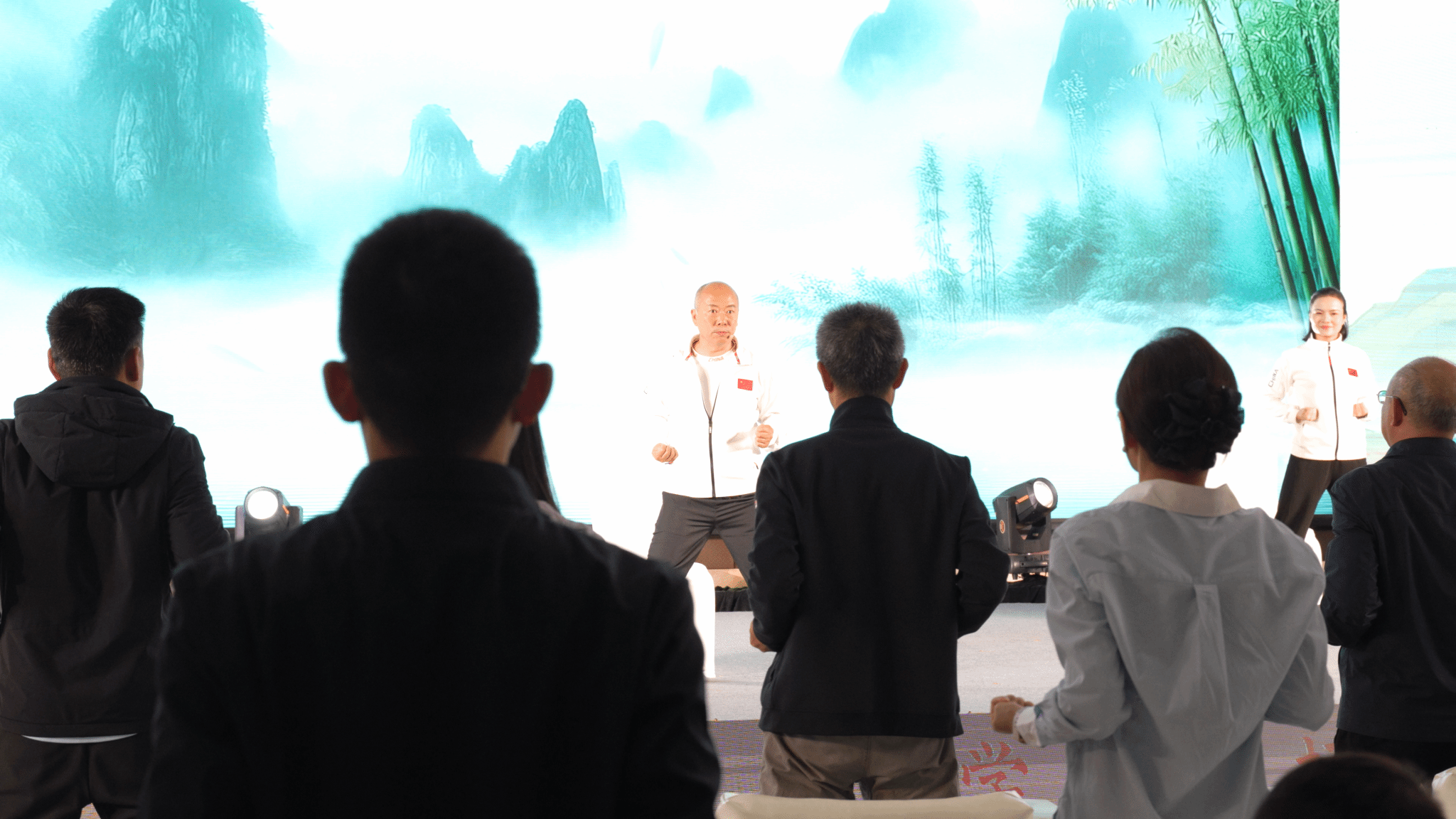 发布会现场,随着悠扬舒缓的音乐响起,邬建卫教授团队登台展示了依据《诸病源候论》等古籍文献自主创编的《案前八段锦》和《导引八段锦》。他们动作刚柔相济、行云流水,不仅完美展现了功法本身“意动形随、神形兼备”的韵味,更将其中蕴含的中医脏腑、经络调理理论通过肢体语言进行了解读。在团队的带领下,全场观众纷纷起身,认真跟练,亲身体验了中医导引术的独特魅力,现场互动紧密,气氛热烈,掌声不断。