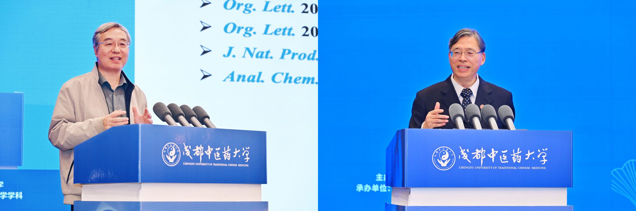 主旨报告环节由南京中医药大学原副校长、南京大学医药生物技术全国重点实验室主任谭仁祥教授和广州中医药大学副校长刘中秋教授主持。中国药科大学原党委常委、副校长孔令义教授以《若干天然产物与作用靶点研究》为题,从复杂结构天然产物化学成分、结构修饰与成药性研究以及潜在药物新靶点与天然活性分子的发现三个方面,结合具体研究案例和实验成果,指出天然药物对人类健康保障具有极为重要的作用。中国医学科学院学部委员、岐黄学者、杭州师范大学国家高水平学科治未病与健康管理学科带头人谢恬教授以《中西医结合“分子配伍”理论创制新药的医教研实践》为题,结合其个人经历、研究成果与教学实践,以团队研发的全球首个基于分子配伍理论的抗癌新药“榄香烯脂质体系统”为例,深入阐释了分子配伍理论在抗肿瘤药物研发领域所实现的关键突破。北京中医药大学中药学院院长雷海民教授以《中国梦 中国医 中国药》为题作报告。他以“中国梦”为引,指出中医药工作者应心怀使命,深入发掘中医药宝库,并通过“中国医”与“中国药”的研究实例,系统解析中医药现代化研发的创新路径。国家“双一流”建设学科中药学学科带头人、国家级教学名师、beat365平台唯一官网原副校长彭成教授以《中药种质资源多元保存多维评价及产业化关键技术研究》为题,剖析中药种质资源创新应用亟待突破的挑战,深度解读创新中药种质资源多元保存体系,创建中药种质资源外在品质、内在品质、性效品质多维评价方法和产业化关键技术突破、产业转化路径及学科发展现状。