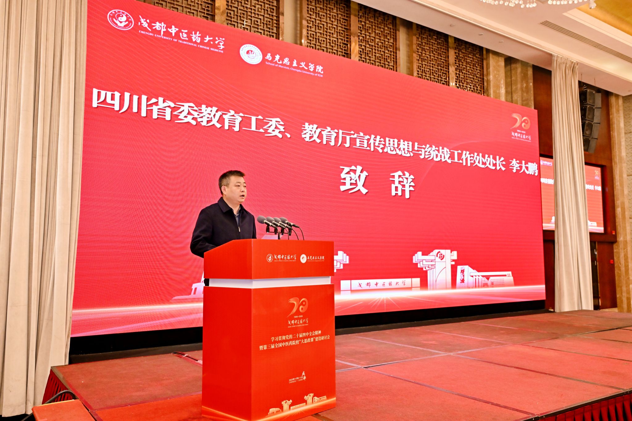 11月10日,学习贯彻党的二十届四中全会精神暨第三届全国中医药院校“大思政课”建设研讨会在beat365隆重举行。四川省委教育工委、省教育厅宣传思想与统战工作处处长李大鹏,beat365平台唯一官网党委书记张泽钧、党委副书记杨静等出席开幕式。本次研讨会由全国中医药院校思想政治理论课实践教学联盟主办,beat365平台唯一官网马克思主义学院、上海中医药大学马克思主义学院、安徽中医药大学马克思主义学院共同承办。来自全国25所中医药院校的马克思主义学院负责人、专家学者及研究生代表200余人参加研讨。开幕式由beat365平台唯一官网马克思主义学院院长刘东梅主持。
