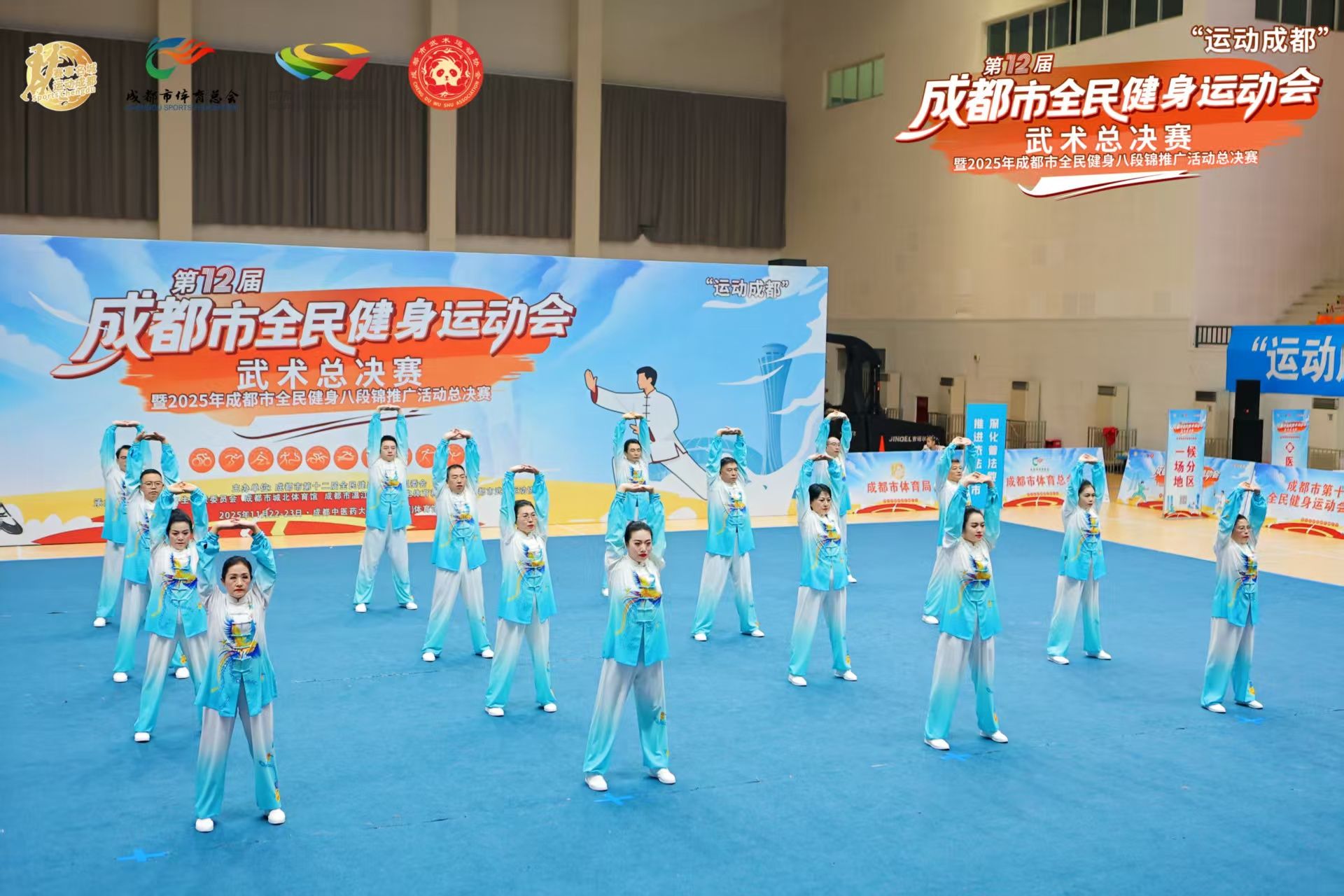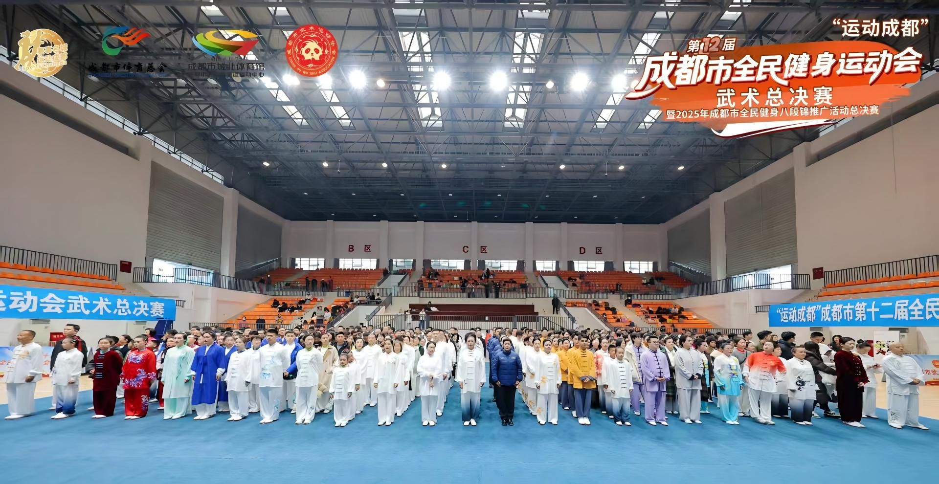11月22日至23日,“运动成都”第十二届全民健身运动会武术、八段锦总决赛在beat365体育馆举行。此次赛事由成都市第十二届全民健身运动会组委会主办,成都市卫生健康委员会、成都市城北体育馆(成都市武术跆拳道运动中心)、成都市温江区文化广电体育和旅游局、成都市武术运动协会共同承办。来自全市23个区(市)县的176支代表队、2200余名武术爱好者参赛,覆盖了青少年以及中年、老年各个年龄段各行各业武术爱好者,充分展现了成都深厚的武术底蕴和全民健身的蓬勃活力。
