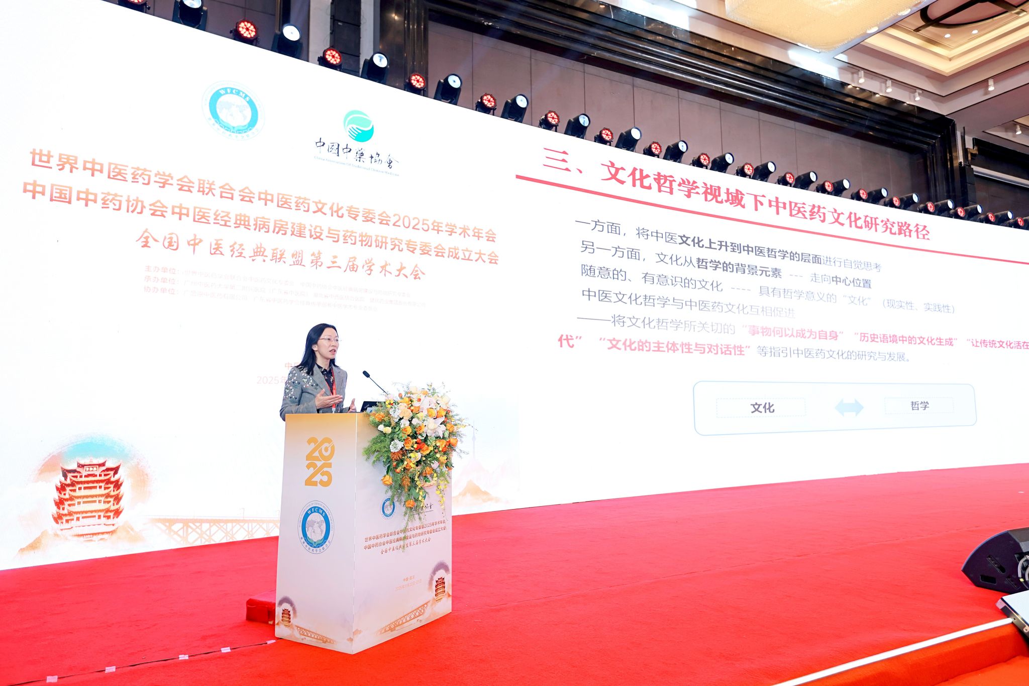 杨静作题为《文化哲学与中医药文化研究》的大会报告。报告紧密围绕文化哲学与中医药文化的内在关联展开深入探讨,从“文化哲学及其价值的再发现”“文化哲学视域下中医药文化研究反思”“文化哲学视域下中医药文化研究路径”三个层层递进的层面,系统解析。她指出,在全球化、数字化、多元化的时代特征下,中医药文化研究需回归于文化哲学视域,强化主体性与对话性,面向人类生命健康,既展现中华智慧,又“日用而不觉”。她从文化自觉、身份认同、价值重构及生命伦理等角度展开分析,提出建立学科交叉研究平台、推动“中医哲学”学科、学术及话语体系建设,深入构建中医药文化的“符号、标识、实践、意义”,助力中医药可亲可信可敬地走向世界。