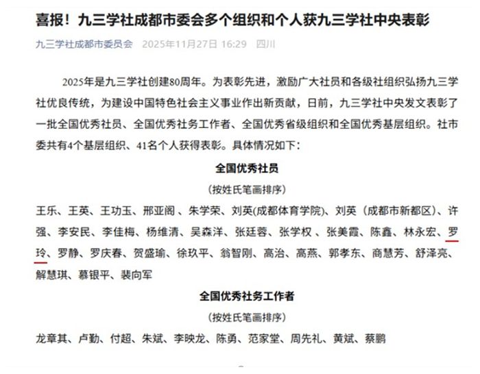 近日,九三学社中央表彰一批全国优秀社员、全国优秀社务工作者、全国优秀省级组织和全国优秀基层组织,成都市政协委员、九三学社beat365平台唯一官网委员会主委罗玲荣获“全国优秀社员”表彰。