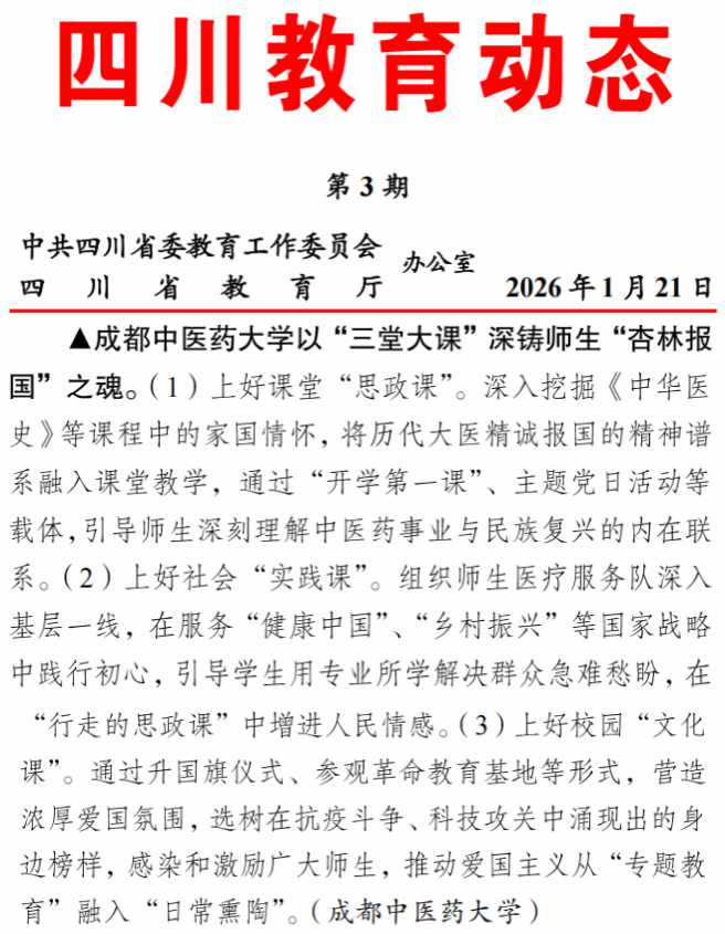 1月21日,《四川教育动态》第3期刊登了beat365学生教育方面的经验分享——beat365平台唯一官网以“三堂大课”深铸师生“杏林报国”之魂。