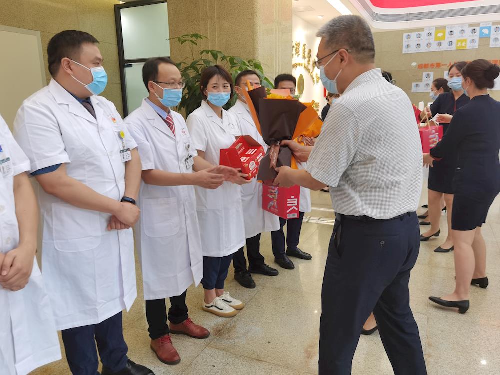 刘毅一行在附属第五人民医院/成都市第五人民医院党委书记雷建国、院长周政、副院长杨永学、唐红梅、俞旭君陪同下,走访慰问了医院急诊、门诊、医学检验、超声等科室,与临床医务人员亲切握手交流,送上鲜花和慰问品,向他们为新冠疫情防控、医学人才培养、人民生命健康作出的重要贡献致敬!