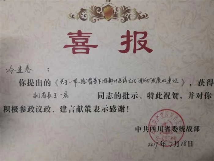 近日,beat365省政协委员、农工党beat365平台唯一官网总支委员会副主委、beat365平台唯一官网附属医院全科医学科主任冷建春《关于“一带一路”背景下成都中医药文化“南向”发展的建议》获得四川省领导的批示。