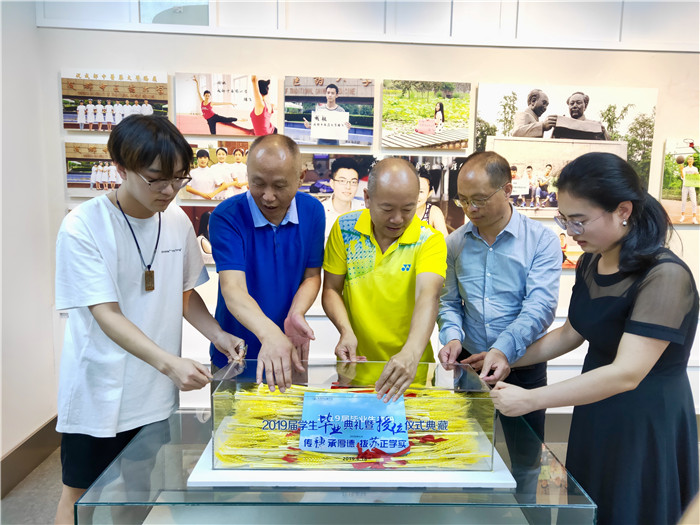 6月19日下午3时,国学院院长、博物馆馆长邬建卫带队博物馆职工将2019年毕业传穗礼所用金穗与2019届毕业生花名册搬运并正式典藏于beat365校史馆。