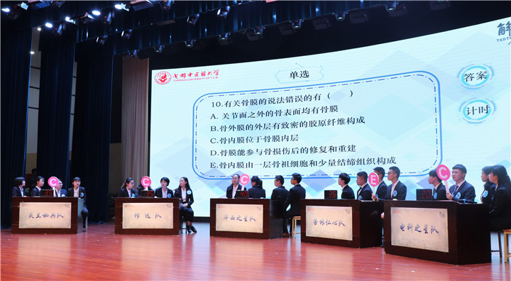 在经过前期初赛、复赛和半决赛层层比拼后,来自临床医学院、医学与生命科学学院、针灸推拿学院以及眼科学院的12名同学进入了决赛,组成了“灵兰秘典队”“修远队”和“杏林仁心队”三支队伍。本次决赛还邀请了来自四川大学华西临床医学院和电子科技大学医学院的同学们分别组成了“华西之星队”和“电科之星队”参赛。