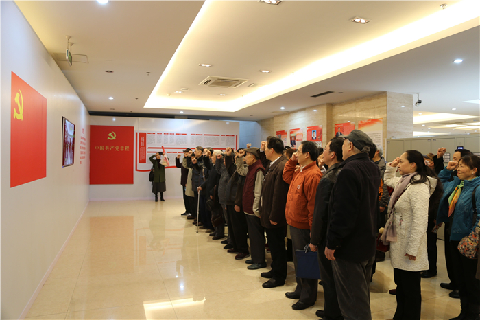 观展前,展览大厅播放了习近平总书记参观中共一大会址后面对党旗宣誓的视频,全体老同志在展览大厅前,庄严地举起右拳,跟随视频重温入党誓词。