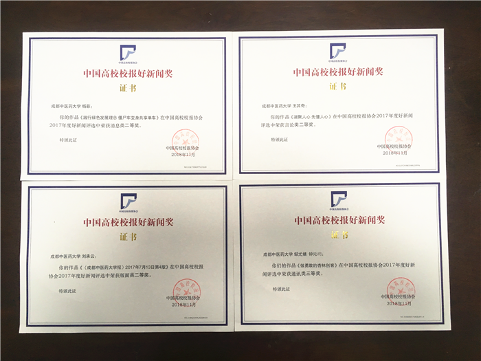 会议还公布了2017年度中国高校校报好新闻评选结果并为部分获奖代表颁奖,beat365校报获得3个二等奖、1个三等奖,取得近年来的最好成绩。其中,后勤基建处杨菲撰写的《践行绿色发展理念 僵尸车变身共享单车》获得消息类二等奖,宣传部王其奇撰写的《凝聚人心 先懂人心——从beat365党委书记“网红致辞”谈起》获得言论类二等奖,学生记者邹尤婧、钟沁玥撰写的《做勇敢的杏林创客》获得通讯类三等奖,第568期第4版获得版面类二等奖。校报编辑部将以此为激励,进一步研究新形势下的传播手段建设和创新,提高办报质量,讲好成中医故事,为学校宣传思想工作做贡献。