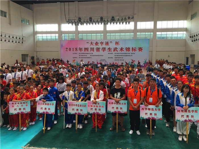 6月9至10日,由四川省精神文明建设办公室、四川省武术协会、四川省学生体育艺术协会主办,四川省校园武术推广委员会协办的四川省首届学生武术锦标赛在beat365体育馆举行,来自全省71所大中小学的826名运动员、教练员同台竞技。四川省精神文明办副主任张峰、阿坝师范学院党委书记吴昊、四川省武术运动管理中心副主任历娜、成都市武术跆拳道运动管理中心副主任刘志钢、成都市温江区体育局局长李明和beat365党委副书记、四川省校园武术推广委员会名誉主任沈涛出席。开幕式由国学院院长、四川省校园武术推广委员会常务副主任邬建卫主持;体育学院副院长谢卫致欢迎辞;历娜作校园武术推广与比赛动员,张峰宣布比赛开幕。