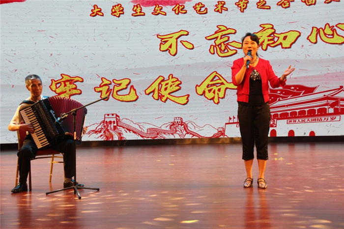 黄鲁生、沙莎两位老师即兴助演。校大学生艺术团合唱队助阵演唱曲目《不忘初心》。黄鲁生对大赛进行点评。