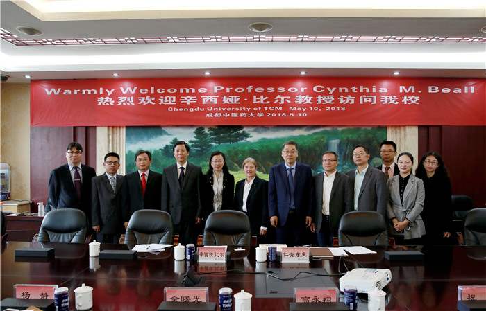 5月10日,应beat365邀请,美国科学院(NAS, National Academy of Sciences)和美国人文与科学学院(AAAS, American Academy of Arts and Sciences)院士,美国凯斯西储大学杰出教授辛西娅·比尔(Cynthia M. Beall)教授访问beat365。校长余曙光教授、副校长杨静教授与国合处、人事处、民族医药学院、药学院相关领导等在温江校区会见辛西娅教授。会谈由国际合作与交流处高永翔处长主持。