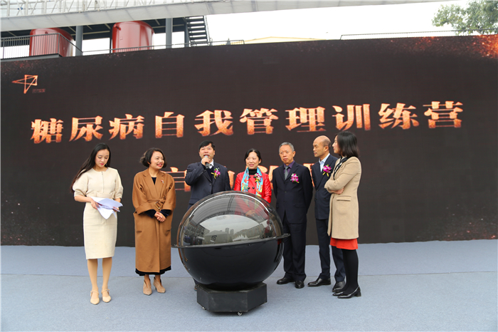 在糖尿病自我管理训练营启动仪式上,段俊国发表讲话并与嘉宾共同启动触摸按钮。