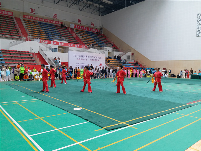 11月2—5日,由四川省教育厅主办、阿坝师范学院承办的2017年四川省高校武术套路比赛在阿坝师范学院体育馆举行,来至全省26所高校的300多名运动员参加了比赛。beat365由校党委副书记、校体委主任沈涛任领队,武术教研室教师李光惠、李万友、鄢显明、陈孝慧、杜景涛任教练,来至全校不同学院的26名同学参加了本次比赛。