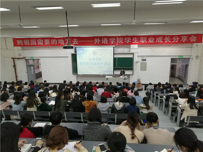 11月13日下午,外语学院邀请新疆内派教师汪俊华和同学们在温江校区分享自身职业成长经历。学院英语、日语、汉语国际教育三个专业的大三大四高年级学生及辅导员老师参加分享会。