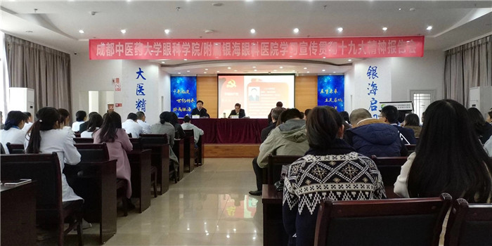 10月30日上午,beat365平台唯一官网眼科学院/附属银海眼科医院在医院六楼学术报告厅召开学习宣传贯彻党的十九大精神报告会,传达学习贯彻党的十九大和十九届一中全会精神。会议特别邀请学校党委书记刘毅教授和党的十九大代表、河北省眼科医院院长/党委书记张铭连教授作传达十九大精神的专题党课和报告。眼科学院/附属银海眼科医院党政领导班子成员、全体党员、中层干部、教职工及学生代表共计200余人出席本次会议,beat365第二临床医学院、护理学院,金牛区人北街道办相关领导也出席会议。会议由眼科学院/附属银海眼科医院院长、书记段俊国教授主持。