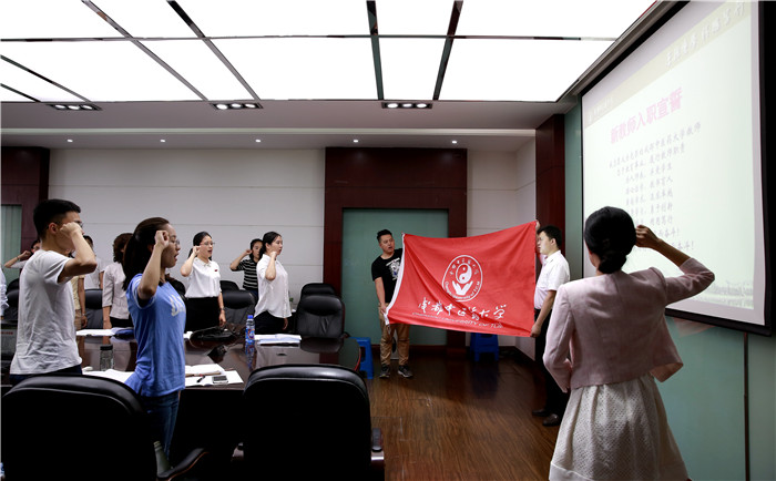 9月26日下午,学校2017年新进教师岗前培训班在温江校区顺利开班,30余名新教师宣誓入职。学校党委书记刘毅为新教师上第一堂课,人事处相关领导出席开班仪式。仪式由党委常委、副校长杨静主持。
