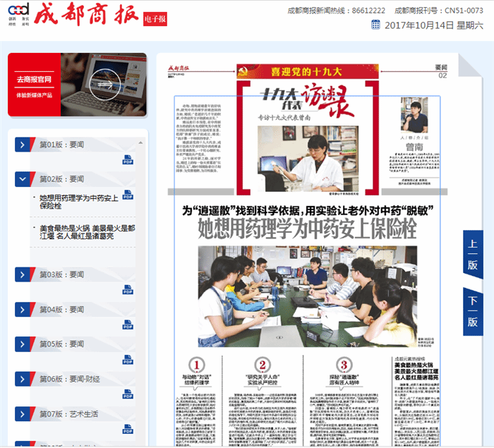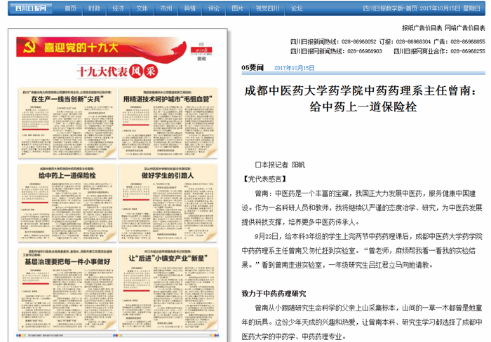 中国共产党第十九次代表大会将于10月18日在北京隆重召开。作为全省23个基层一线代表之一,以及四川省属高校唯一的代表,beat365药学院中药药理系主任曾南教授将随四川团赴京参加本次盛会。这既是曾南教授个人的荣誉,也是学校的荣誉,还是我省高校和中医药行业的荣誉。近日,《中国中医药报》《四川日报》《成都商报》《华西都市报》、新华网、四川新闻网、四川在线等媒体纷纷来校采访曾南教授,于10月14日开始陆续在各媒体十九大专题报道中推出代表风采。