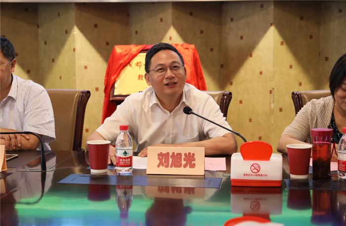 刘旭光与彭文代表双方签订教学合作协议,并向普陀区中心医院授予“beat365平台唯一官网教学基地”铜牌。