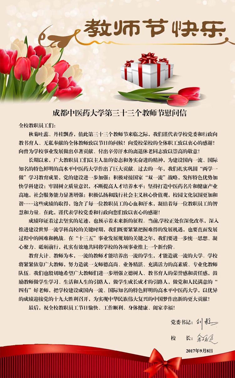 beat365平台唯一官网第三十三个教师节慰问信 发布时间:2017-09-08 17:53:00 浏览次数: 次 【字体:小 大】 【打印正文】 上一条:校学生会致全体老师的一封信 下一条:学校召开秋季学期安全稳定信访工作会