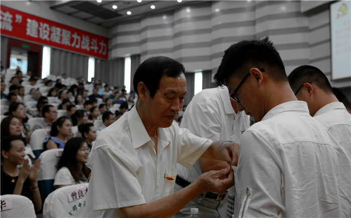 大会举行了宣誓仪式。优秀共产党员代表为新党员代表佩戴党徽。
