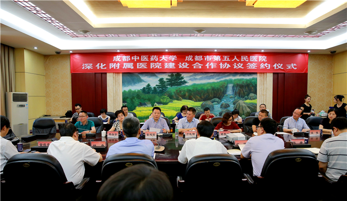 雷建国致辞,介绍成都市第五人民医院基本情况。他说,成都市第五人民医院作为国家三级甲等综合医院、成都西部区域医疗中心、微创特色医院、老年病特色治疗医院,在医疗服务、学科专科建设等方面特色优势突出。此次与成中医签订深化附属医院合作协议,在医院原有“beat365平台唯一官网附属成都市第五人民医院”院牌基础上,增挂“beat365平台唯一官网第二临床医学院”和“beat365平台唯一官网临床医学中心”牌子,有利于助推健康成都建设,有利于校院双方优势互补、医教研协同、师资队伍建设、教学条件改善、实验实训中心建设、资源共享、学术交流合作等,为建设区域高水平教学型、研究型医院,进一步提提升临床医学人才质量,提供了长期健康发展平台。
