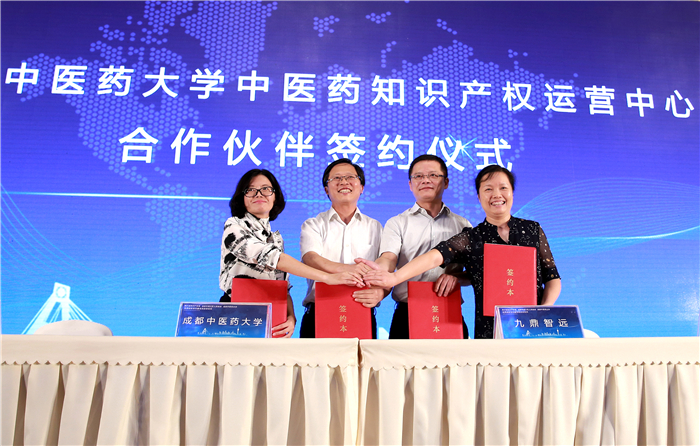 彭成与董事长四川九鼎智远知识产权运营有限公司徐宏、四川力久律师事务所主任王芸、高远知识产权代理事务所所长李高峡签署合作伙伴关系意向书。