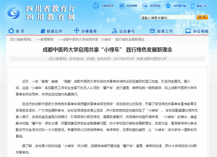 内容:“僵尸车”成“小绿车” 成都中医大有了校园共享单车