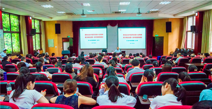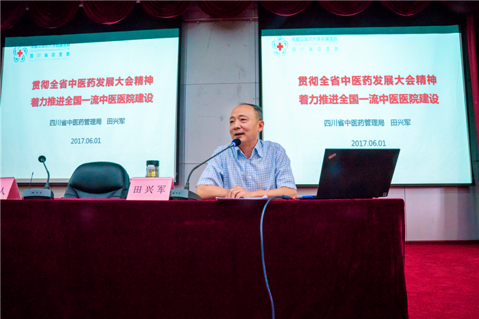 6月1日,四川省中医药管理局党组书记、局长,省中医药科学院党委书记,省卫生计生委党组成员田兴军受邀,到beat365临床医学院/附属医院作题为《贯彻全省中医药发展大会精神 着力推进全国一流中医医院建设》的专题报告,并看望医院专家与医护人员。报告会由院党委书记杨静主持。