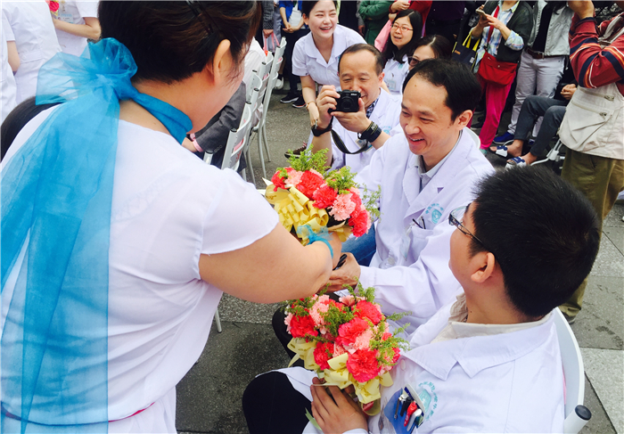 医患情深,一位7年前患肺癌在医院肿瘤科治疗康复后的患友,来到现场,深情舞蹈《爱的奉献》,为医护献花,感谢医护人员给了她第二次生命。